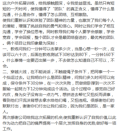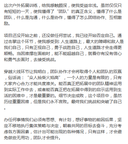 此次拓展團建活動,不僅培養(yǎng)了大家的積極的工作態(tài)度和高度的工作責任心,充分開發(fā)了個人潛力,還讓大家深刻體會到了團隊的力量以及相互溝通協(xié)作的重要性,這為以后的工作奠定了很好的基礎(chǔ)。離開了拓展訓練基地,回到更為廣闊的工作環(huán)境,我們相信,只要我們充分發(fā)揮拓展活動中互助互信的團隊精神,把每一件工作當作是拓展訓練中的一次挑戰(zhàn),就沒有戰(zhàn)勝不了的困難,沒有解決不了的難題!