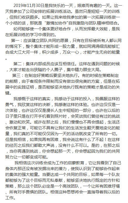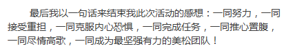 本次活動,同事們在實踐鍛煉中學習,在體驗學習中改變,受益匪淺,有了更多的人生感悟。在體驗著奉獻、協(xié)作、勇敢?guī)淼某晒ο矏偤?,每個人深刻感受到|溝通、責任、協(xié)作、勇敢、自信|的精髓,以及作為團隊中的一員所要承擔的責任,正如美松智能總經(jīng)理黃楊靜先生及同事們所言,利用周日休息天還在撰寫感悟傳遞著: