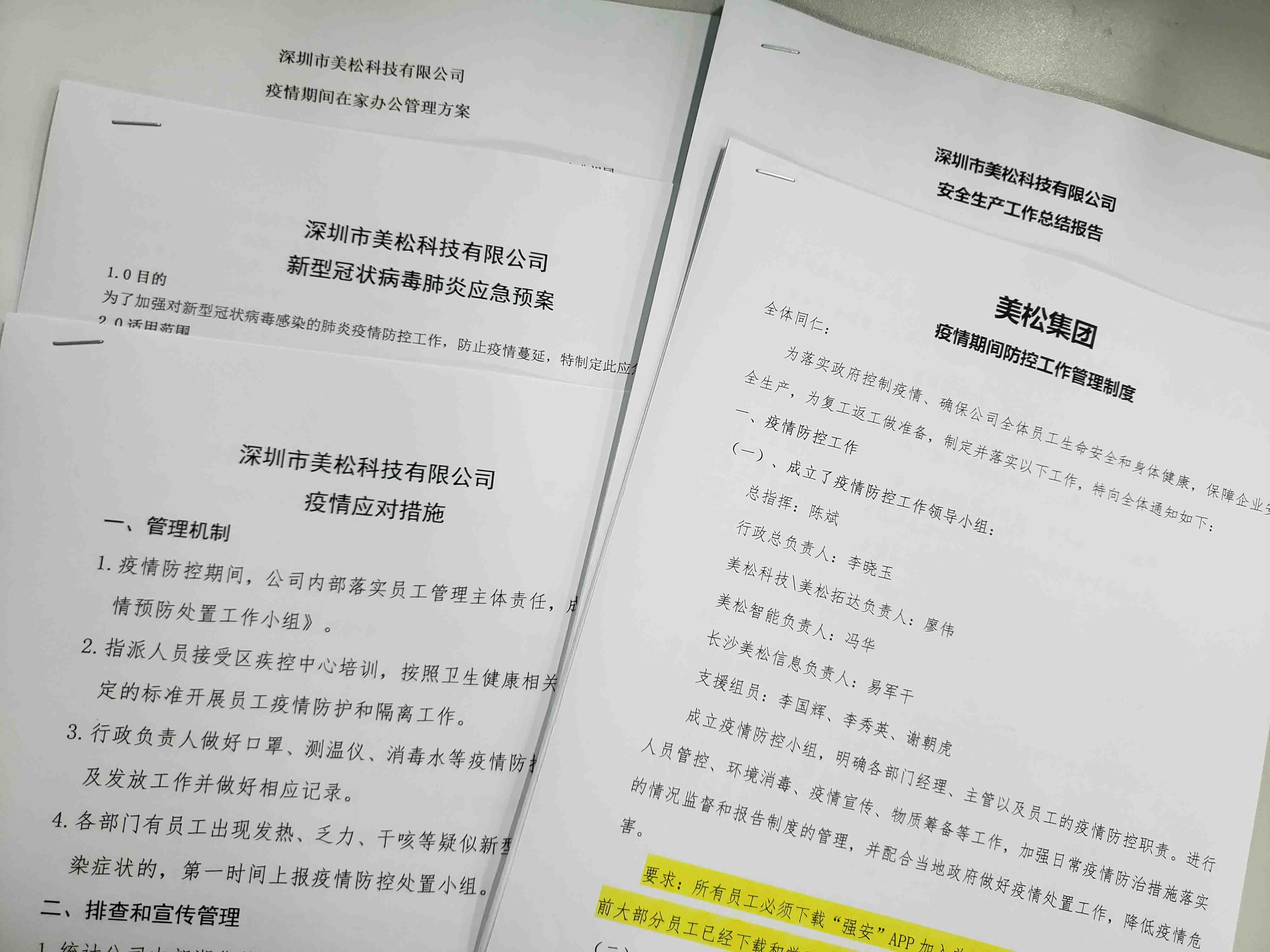 開工復工在即,我們美松集團及各下屬子公司也做了充分準備工作,面對如此特殊疫情時期,深圳美松集團特制定了《疫情期間防控工作管理制度》、《疫情期間在家辦公管理方案》、《安全生產(chǎn)工作報告》、《應對疫情應對措施》、《新型冠狀病毒應急預案》,利用網(wǎng)絡、電話、現(xiàn)場等多種形式相結(jié)合的方式為客戶提供服務,保障客戶需要,通過差異化的管理,做到疫情防控和經(jīng)營服務“兩不誤”。無論是在家辦公,還是到崗辦公,全體員工全身心投入到工作當中,保持著積極的工作熱情。