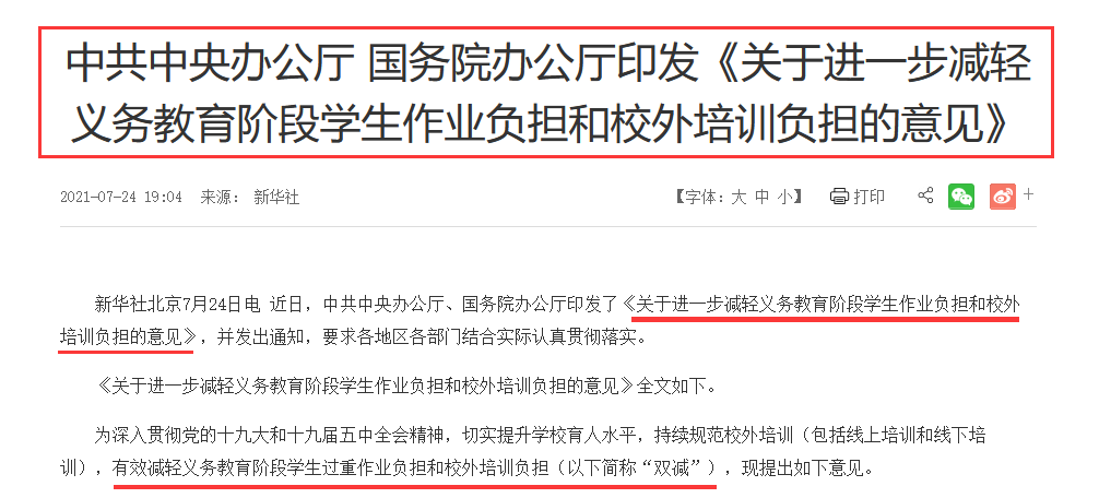 教育是百年大計,為管理校外培訓不斷標準規(guī)范化,近期,中共中央辦公廳、國務院下發(fā)了有關于進一步減少九年義務基礎教育階段的《意見》和“雙減”(如下圖),引起社會的諸多觀注。