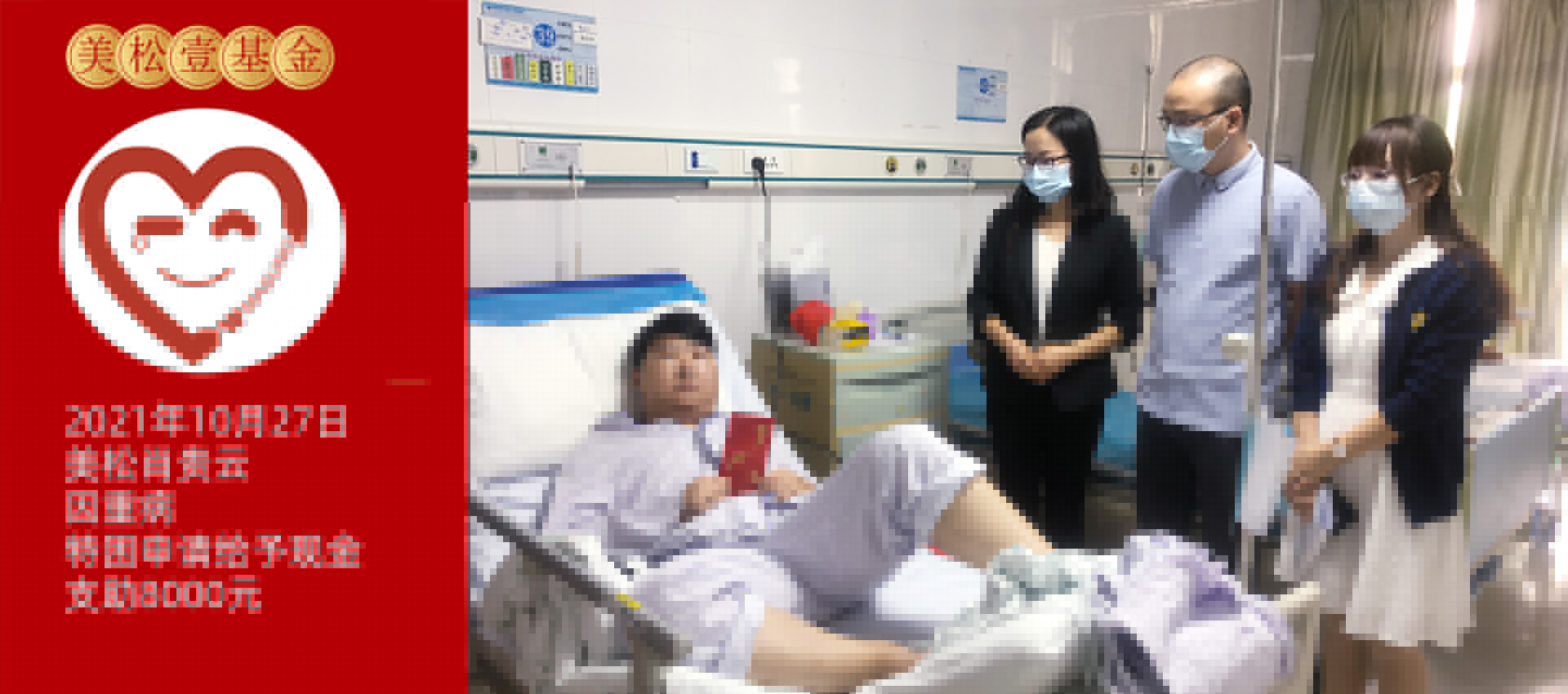 2021年10月27日,美松壹基金委員朱素芳、行政部肖華、廠務(wù)副總戴輝,一同前往光明醫(yī)院慰問生病員工資材部同事肖貴云,為肖貴云及其家人送去8000元愛心款項(xiàng)支助,并表達(dá)了親切的問候,在詳細(xì)了解了其病情及治療情況后,囑咐他安心休養(yǎng),爭取早日康復(fù)!