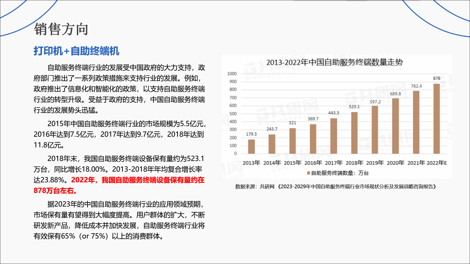 自助服務(wù)終端行業(yè)的發(fā)展受中國政府的大力支持,政府部門推出了一系列政策措施來支持行業(yè)的發(fā)展。例如,政府推出了信息化和智能化的政策,以支持自助服務(wù)終端行業(yè)的轉(zhuǎn)型升級。受益于政府的支持,中國自助服務(wù)終端行業(yè)的發(fā)展勢頭迅猛。201 5年中國自助服務(wù)終端行業(yè)的市場規(guī)模為5.5億元,2016年達到7.5億元,2017年達到9.7億元,2018年達到11.8億元。201 8年末,我國自助服務(wù)終端設(shè)備保有量約為523.1萬臺,同比增長18.00%。2013-2018年年均復合增長率達23.88%。2022年,我國自助服務(wù)終端設(shè)備保有量約在878萬臺左右。