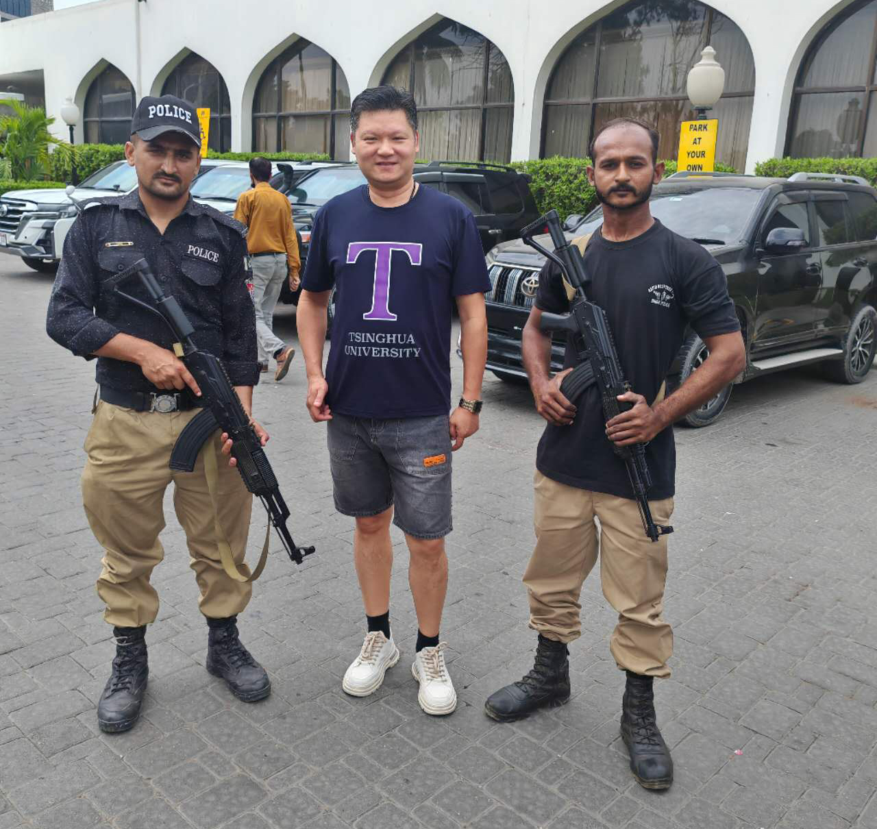 談到中巴友誼,政府部門的工作細(xì)致服務(wù)到位,用圖說話,他們用實(shí)際行動保護(hù)著每一個中國公民的出行安全,無不彰顯中巴鐵桿兄弟情誼,瞧!警察同志開著警車手持真槍實(shí)彈護(hù)送美松集團(tuán)陳董事長前往展館布展。