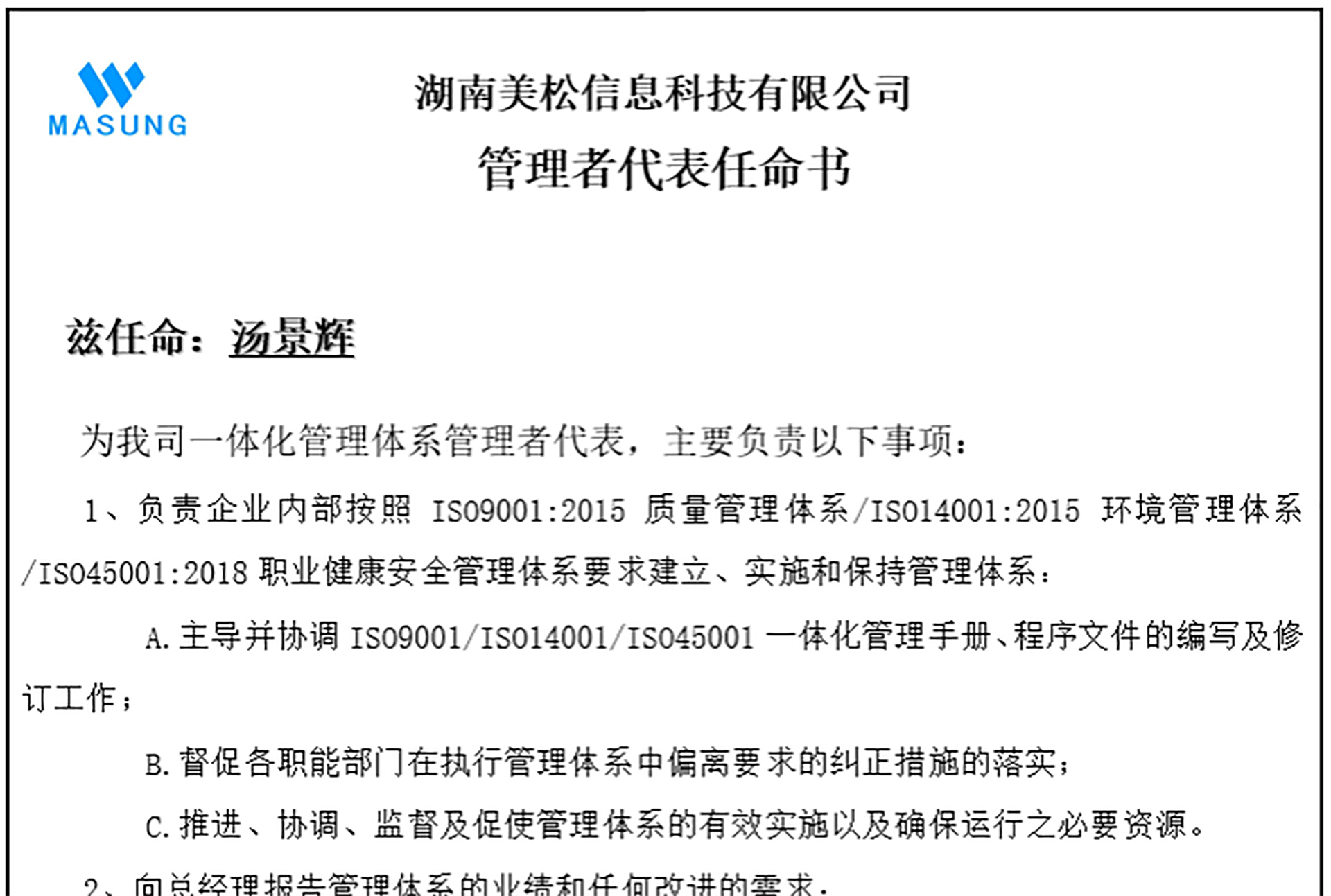 會議最后,饒老師激勵大家:體系管理絕非一朝一夕之功,而是一項(xiàng)需要不斷學(xué)習(xí)、改進(jìn)和堅(jiān)持的長期工程。在座每一位美松人都是體系建設(shè)的主力軍,也是公司持續(xù)發(fā)展的中堅(jiān)力量。未來愿與美松一起在體系管理的道路上不斷探索、不斷創(chuàng)新。以ISO系列體系為支撐,必將打造品質(zhì)+綠色+安全MASUNG美松的企業(yè)品牌,創(chuàng)造更多的價值。