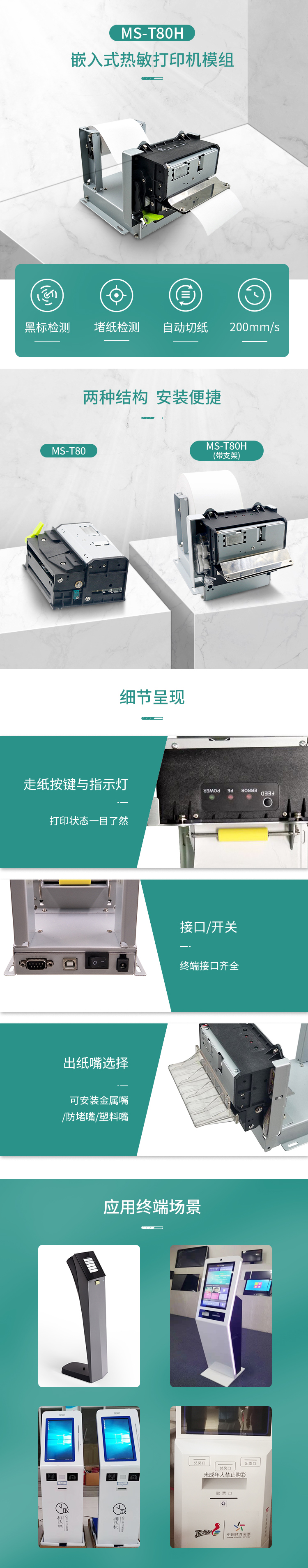 MS-T80/H 打印模塊采用AOI行式熱敏打印頭片,它具有高速打印、噪聲低、 可靠性強(qiáng)、打印質(zhì)量高。該打印機(jī)結(jié)構(gòu)小巧、同時擁有自動進(jìn)紙、自動切紙、黑 標(biāo)檢測、紙將盡檢測等功能。 此模組 ALL-IN-ONE,控制板與機(jī)芯完全結(jié)合為一體,大大節(jié)省了模組的空 間,極大地方便了模具的開發(fā)設(shè)計(jì)。此打印機(jī)擁有走紙按鍵及指示燈,讓終端用 戶使用起來更簡單、流暢。打印機(jī)適應(yīng)領(lǐng)域:適用于自助查詢終端、排隊(duì)機(jī)、ATM、彩票打印、日志打 印、自助話費(fèi)清單打印機(jī)、自助發(fā)票打印、自助繳費(fèi)機(jī)等領(lǐng)域的使用。