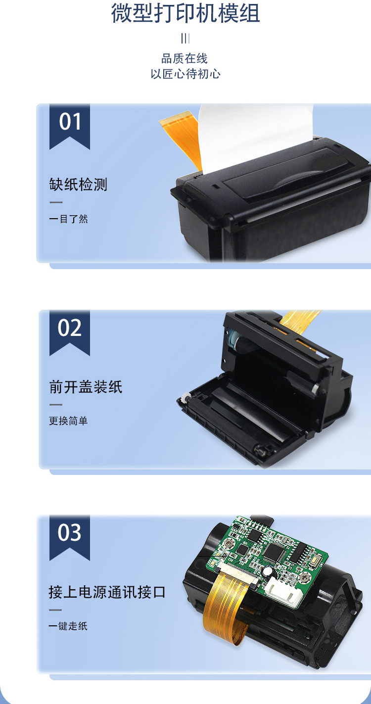 微型打印機(jī)特點(diǎn):前開(kāi)蓋維護(hù),無(wú)需拆開(kāi)終端設(shè)備就可實(shí)現(xiàn)換紙和維護(hù),5V低電壓供電58mm打印機(jī),嵌入體積小巧