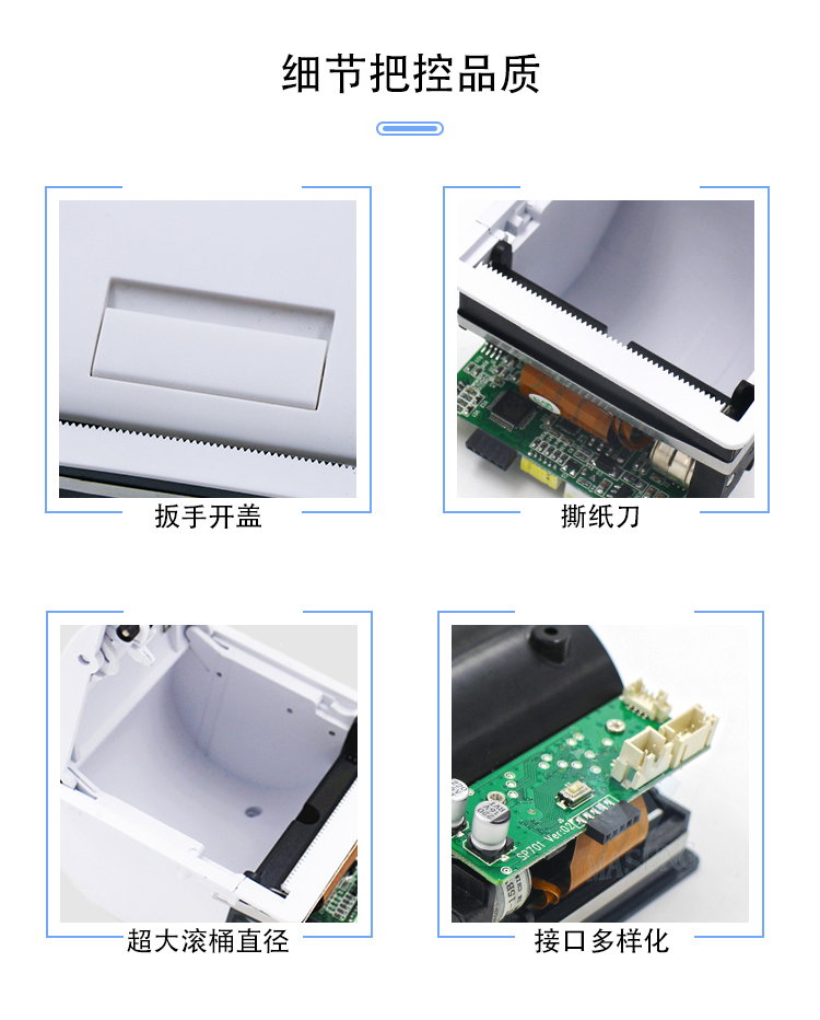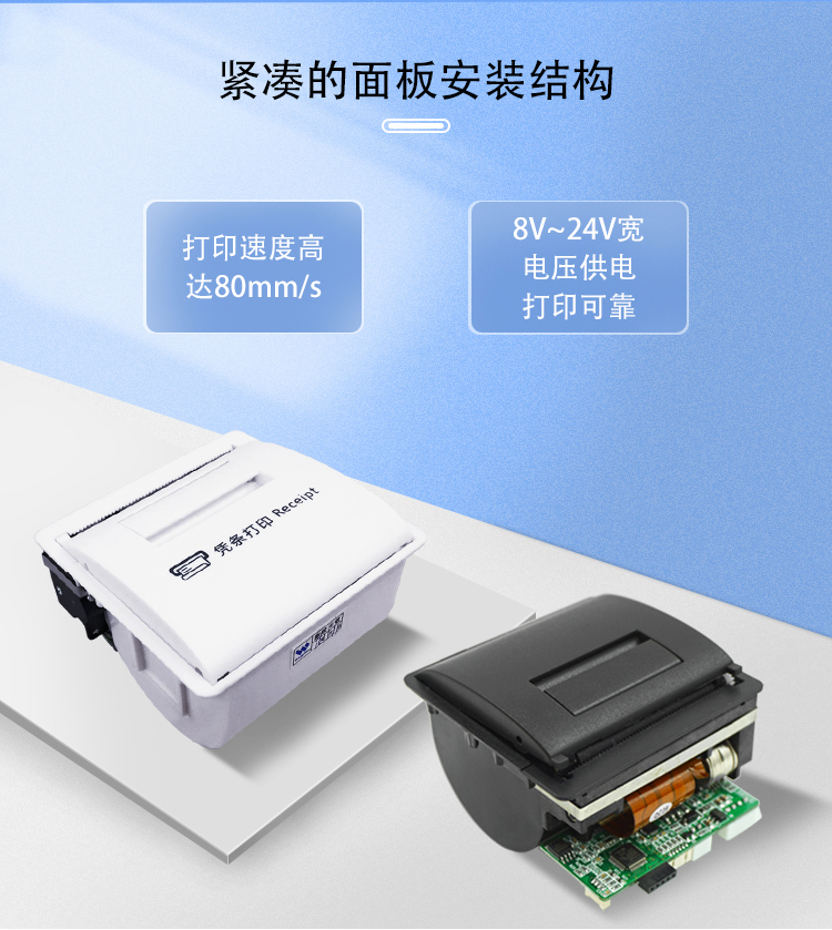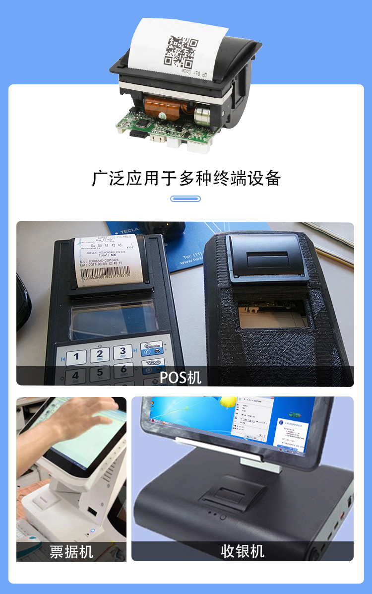 微型打印機(jī)特點(diǎn):前開蓋維護(hù),無需拆開終端設(shè)備就可實(shí)現(xiàn)換紙和維護(hù),8V~12V低電壓供電58mm打印機(jī),嵌入體積小巧