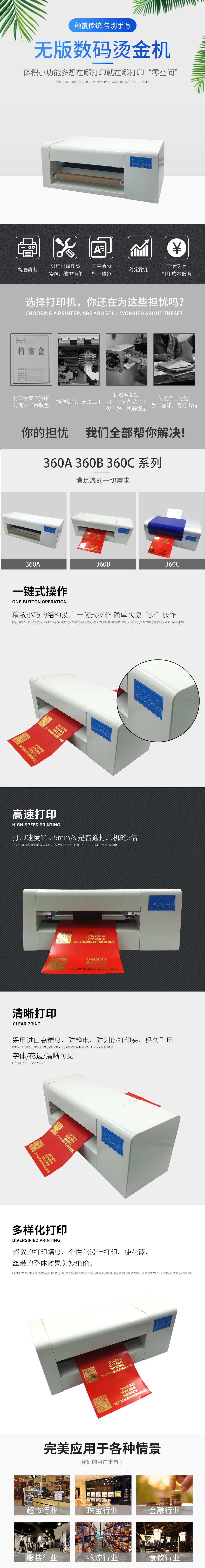 美松數(shù)碼無版燙金機印花機采用燙金熱轉(zhuǎn)印領(lǐng)先技術(shù),完全實現(xiàn)了單張自動進紙功能,省時又省力;無需制版直接打印電腦操作方便快捷.印花機主板采用全新智能四核CPU變頻控制,使打印頭徹底解決熱量堆積,延長打印頭使用壽命五倍以上.印花機軟件控制可打印圖案文字照片電腦自動識別位置無需挪動介質(zhì),功率低,噪聲低,便于用戶使用.支持windows操作下的主流應(yīng)用軟件,例如: Coredraw, Word等國際通用軟件;直接usb,U盤輸出可隨時隨地操作,根據(jù)材質(zhì)需要可隨意調(diào)節(jié)行走速度;同一版面可打印多種顏色,獨有的定位板可確保每種顏色的打印位置準(zhǔn)確無疑.