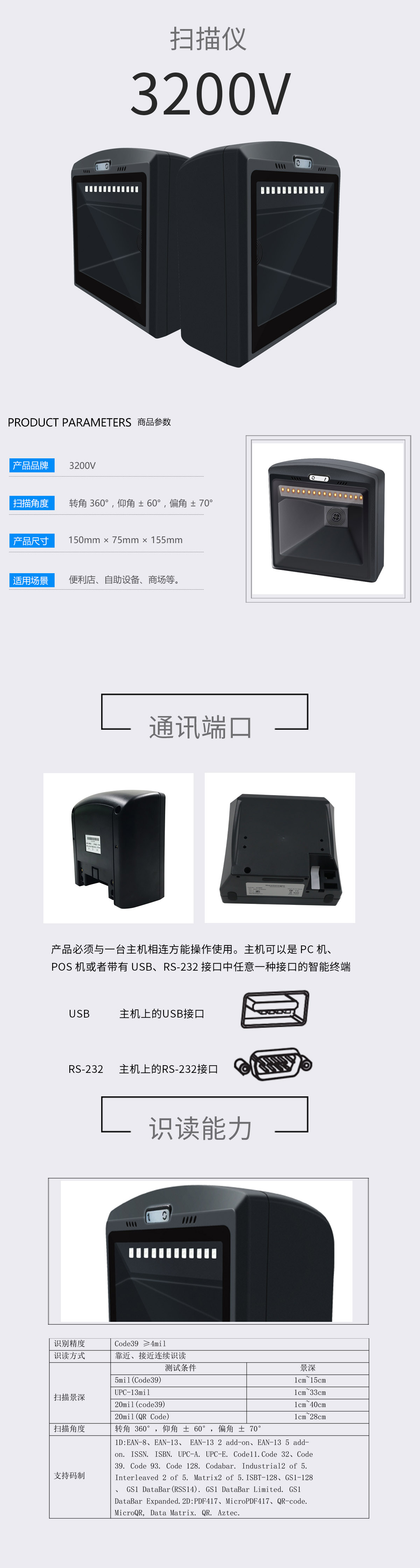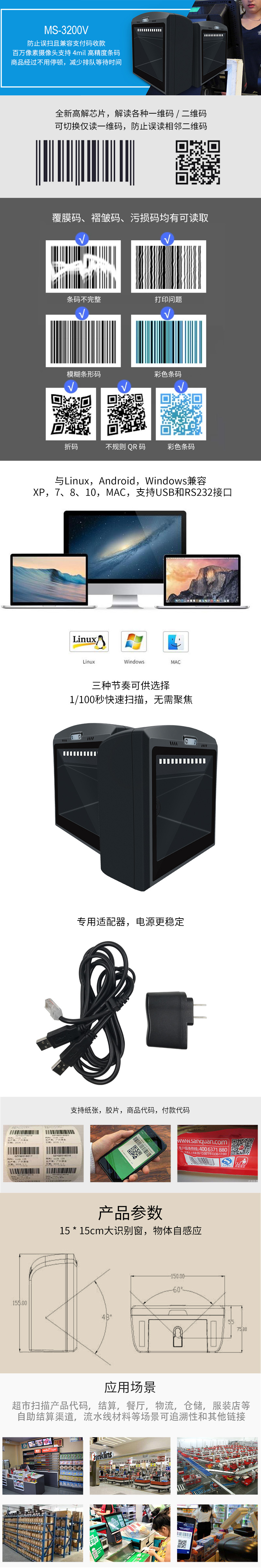 美松二維碼掃描平臺MS-3200V掃描完全自主研發(fā),擁有全套專利,即插即用無需安裝驅(qū)動.寬電壓設(shè)計,專用適配器,供電更穩(wěn)定,避免了因電壓波動導(dǎo)致數(shù)據(jù)傳輸無法上傳情況的發(fā)生.采用 32 位主控芯片搭載專利軟體,可順暢解讀反光,打皺,模糊,彩色條碼,強光及暗光環(huán)境下也可正常解碼.采用全鉭電容及抗氧化光學(xué)工藝,避免了傳統(tǒng)掃描槍使用一段時間后靈敏度下降問題.二維影像式掃描平臺,掃描槍,掃碼器,餐飲零售,快遞倉儲,物流超市,商品條碼,手機屏幕掃碼收款.兼容Linux,Android,Windows XP,7,8,10,MAC,支持USB和RS232接口.支持紙質(zhì),薄膜類,商品碼,付款碼讀取,支持低對比度,高密度的DM碼等的讀取.