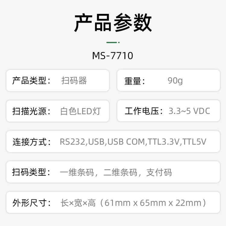 美松二維碼掃描模塊MS-7710采用遠距離圖像傳感器,支持遠距離識讀;針對陽光和夜晚模式進行優(yōu)化,全天24小時均可正常識讀,無人值守更省人工;兼容紙質(zhì)條碼掃描,為停車券應(yīng)用量身定制;寬溫-30~70度,南方北方輕松應(yīng)對;豐富的接口適用各種傳輸方式;寬電壓設(shè)計,供電更靈活,避免單獨再拉供電電源.圖像采集器與解碼板一體化設(shè)計,重量極輕,集成度高,極易嵌入到各種產(chǎn)品應(yīng)用中,如公交掃描,自助機掃描,閘機掃描,取票機掃描,寄存柜掃描,智能門禁掃描.