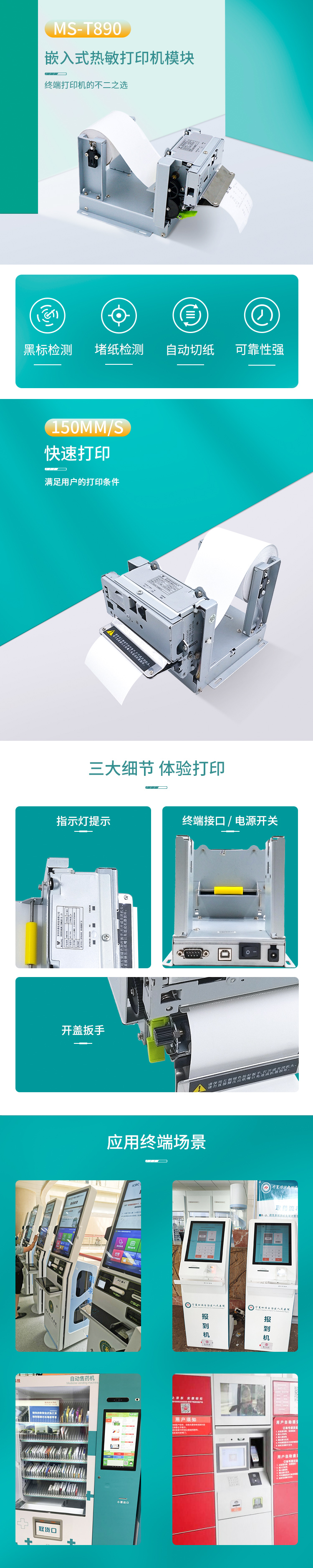美松(MASUNG)80mm嵌入式熱敏打印機MS-T890打印機是一種新型行式熱敏打印機,擁有自動進紙、自動切紙、黑 標檢測等功能,另可增加防堵紙、紙將盡等功能。適用于KIOSK、自助查詢終端、排隊機、ATM、停車場憑 條打印、彩票打印、日志打印、自助話費清單打印機、自助發(fā)票打印、自助繳費 機等領(lǐng)域的使用。