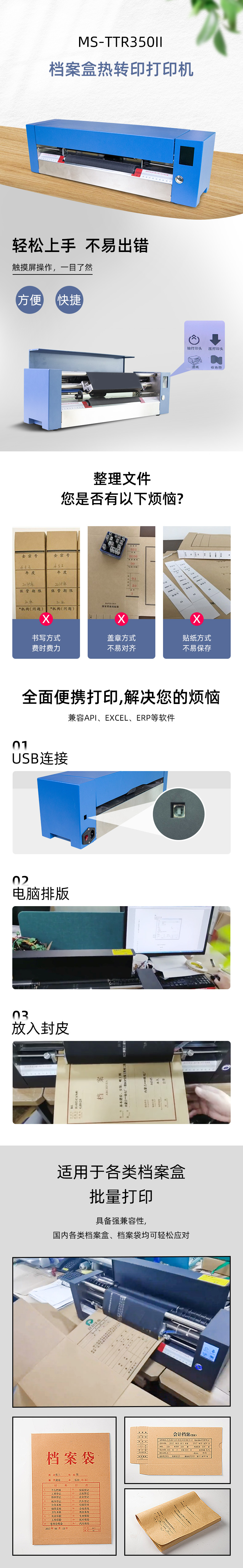 美松MASUNG自主研發(fā)A3+標準檔案盒封面打印機 1.專業(yè)打印牛皮紙,證件內(nèi)頁,無酸紙檔案盒 2.對接API,EXCEL,ERP等數(shù)據(jù)庫專業(yè)的編輯軟件,自定義打印 3.USB連接操作簡單,耗材成本低,長久保存 4.智能打印,整齊規(guī)范化,助力智慧辦公