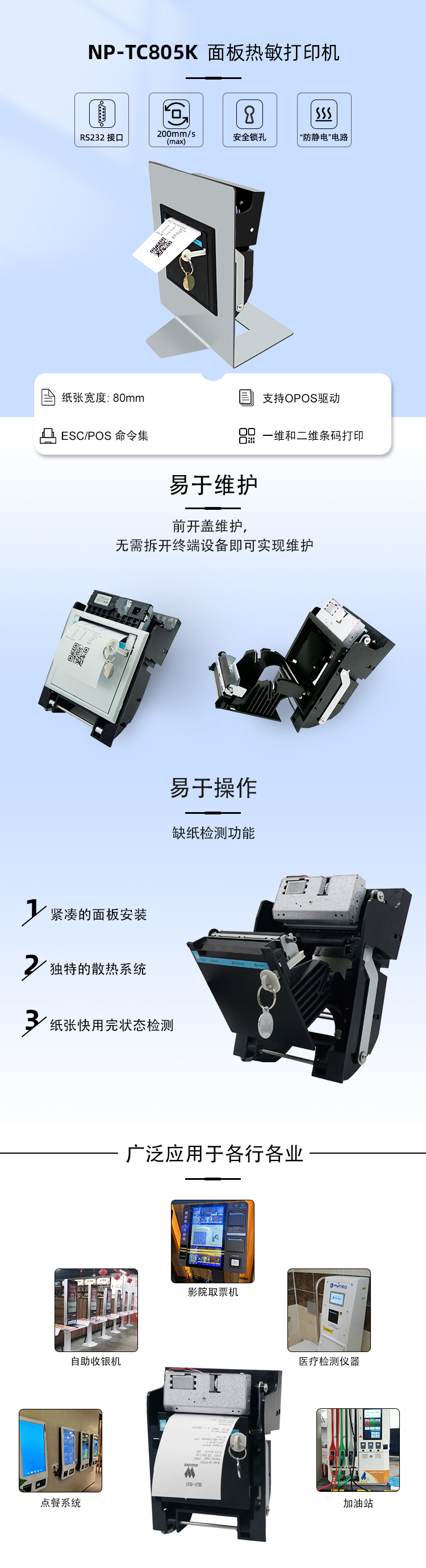 1.超薄機(jī)身設(shè)計(jì),專用于高度集成的終端服務(wù)設(shè)備 2.紙倉(cāng)最大化設(shè)計(jì),80*80大紙卷,避免頻繁換紙 3.開蓋方式多樣化:按鍵,鑰匙和電子鎖開蓋 4.前維護(hù)式,不需要打開機(jī)柜換紙 5.分為有邊框和無(wú)邊框,無(wú)邊框更易嵌入在終端服務(wù)設(shè)備