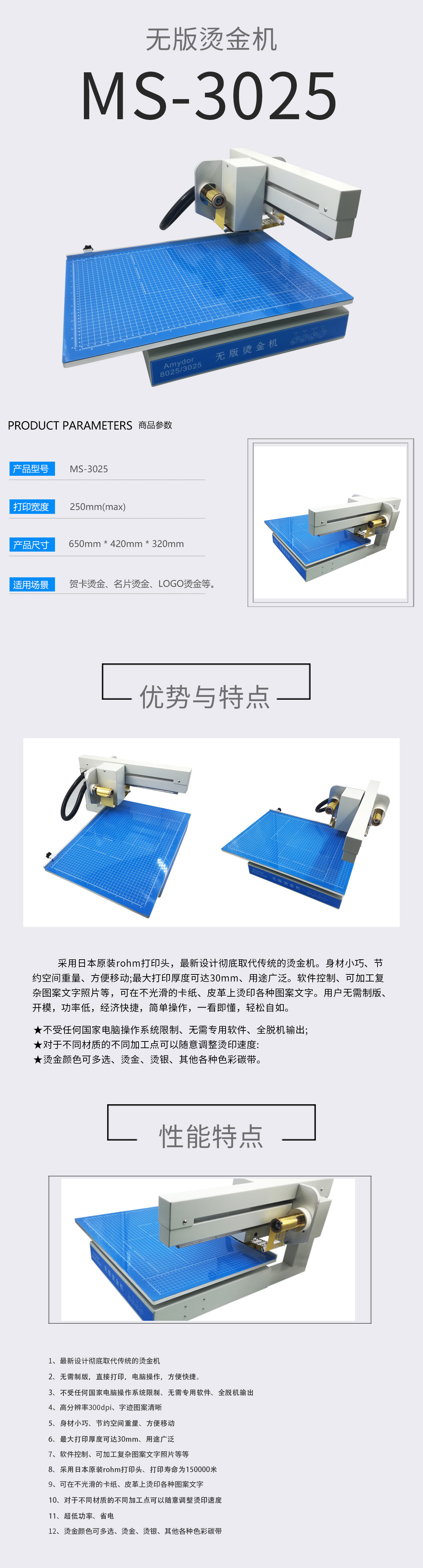 美松無(wú)版數(shù)碼燙金機(jī)MS-8025,MS-3025采用日本原裝rohm打印頭,最新設(shè)計(jì)徹底取代傳統(tǒng)的燙金機(jī)。身材小巧、節(jié)約空間重量、方便移動(dòng);最大打印厚度可達(dá)30mm、用途廣泛。軟件控制、可加工復(fù)雜圖案文字照片等,可在不光滑的卡紙、皮革上燙印各種圖案文字。用戶無(wú)需制版、開(kāi)模,功率低,經(jīng)濟(jì)快捷,簡(jiǎn)單操作,一看即懂,輕松自如。