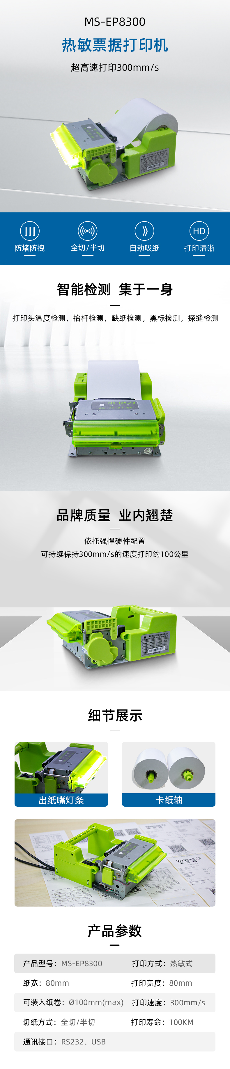 以“清新綠”作為主色新一輪創(chuàng)新的美松特色產(chǎn)品上市,在顏色上凸顯清新脫俗的生命力和綠色環(huán)保低碳的生活理念,讓人耳目一新; 在高效率打印技術(shù)上也突破了以往的打印速度,高配版本達(dá)到300mm/s,在保證打印質(zhì)量的同時,超快打印速度 打印頭側(cè)翻蓋設(shè)計,維護(hù)簡單; 增加防堵紙檢測傳感器等功能,打印工作將故障排除在千里之外; 搭配100毫米直徑的紙卷,減少換紙頻率; 優(yōu)化外觀設(shè)計,選擇優(yōu)質(zhì)圓潤的塑膠外殼,操作使用更加安全可靠; 一款打印寬度為80mm的熱轉(zhuǎn)印打印機(jī),最大紙卷寬度為100mm