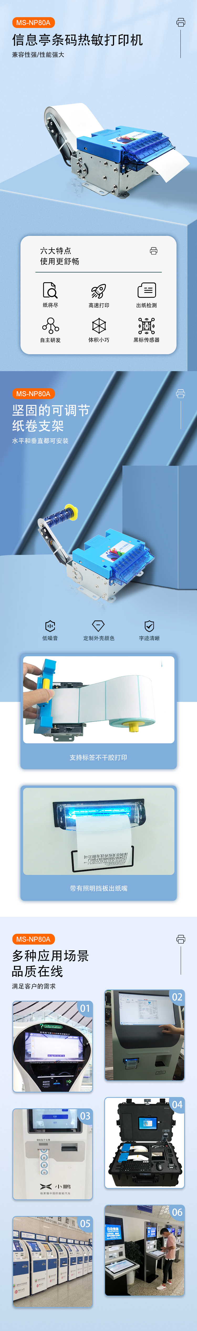 隨著疫情的影響,無人自助式終端設(shè)備的需求也在逐漸變大,無人自助式終端設(shè)備往往由多個(gè)小型設(shè)備構(gòu)成,其中就需要微型的嵌入式打印機(jī),為了實(shí)現(xiàn)自助終端設(shè)備的穩(wěn)定性,需要打印機(jī)具有良好的性能,MS-NP80A具有體型小巧,高集成度等特點(diǎn)可方便嵌入各種自助設(shè)備。