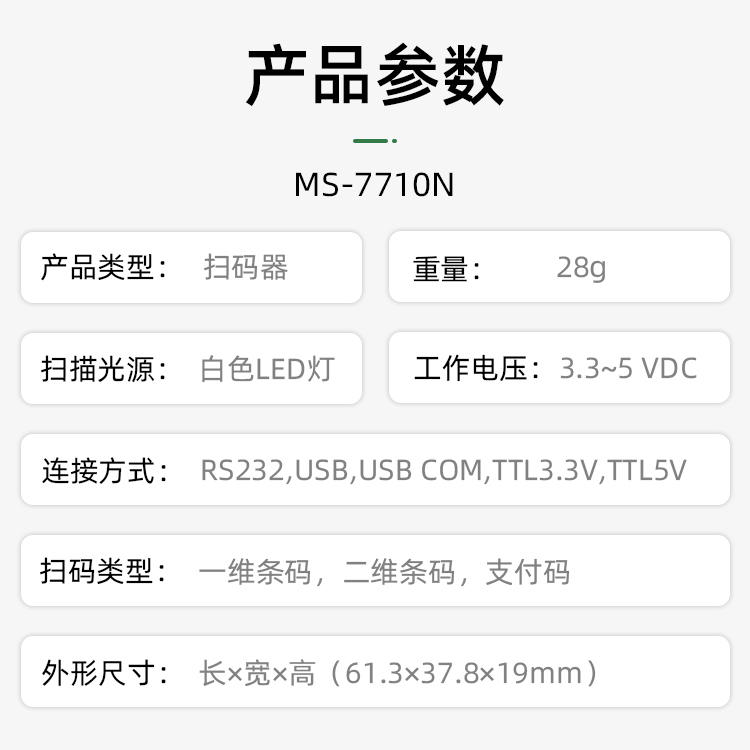 兼具一維/二維碼;紙質(zhì)和手機碼掃描 超薄19mm,窗口4cm*3cm更宜集成 漫反射補光 高集成度,集成蜂鳴器,補光燈,端子接口在一塊板上,更穩(wěn)定 3.6-6V寬電壓設(shè)計,ESD保護電路 OCR身份證識讀(選配)