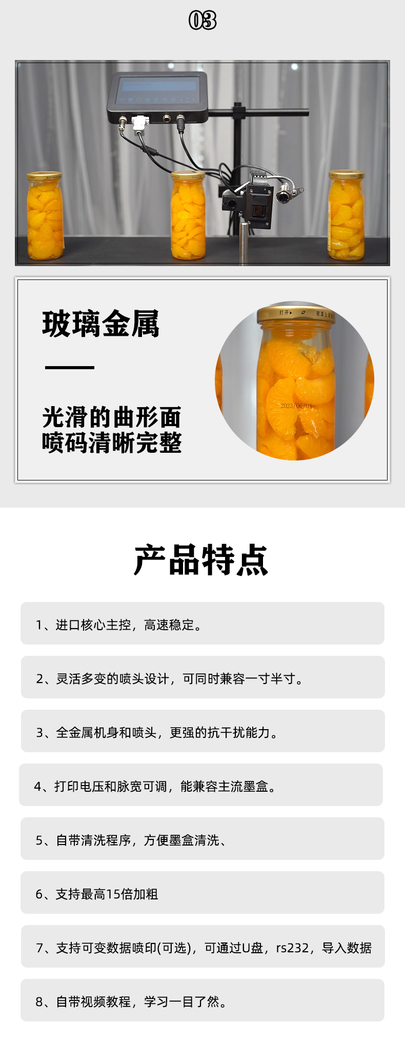 1、進口核心主控,高速穩(wěn)定。 2、靈活多變的噴頭設(shè)計,可同時兼容一寸半寸。 3、全金屬機身和噴頭,更強的抗干擾能力。 4、打印電壓和脈寬可調(diào),能兼容主流墨盒。 5、自帶清洗程序,方便墨盒清洗、 6、支持最高15倍加粗 7、支持可變數(shù)據(jù)噴印(可選),可通過U盤,rs232,導(dǎo)入數(shù)據(jù) 8、自帶視頻教程,學(xué)習(xí)一目了然。