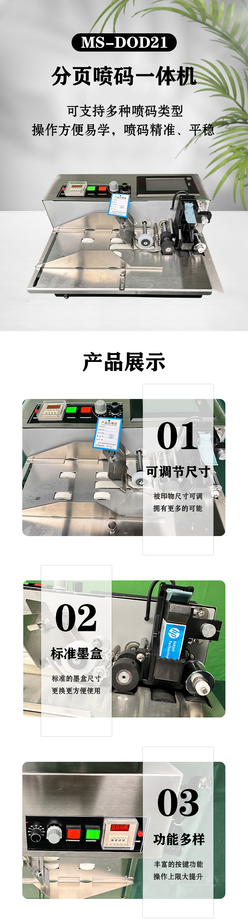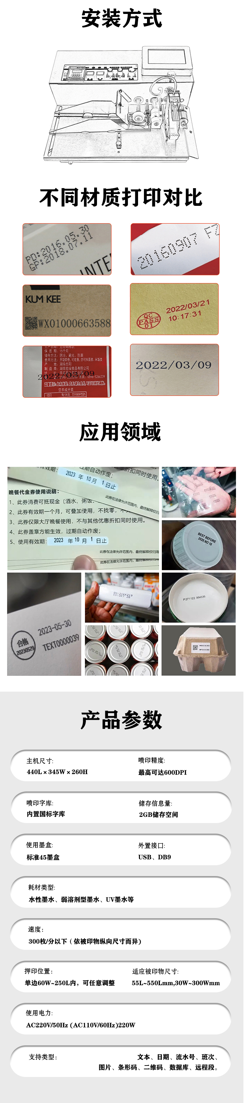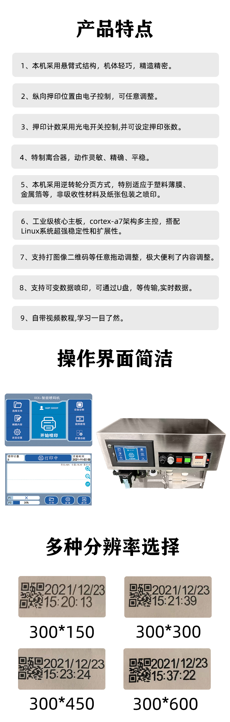 1、本機采用懸臂式結(jié)構(gòu),機體輕巧,精造精密。 2、縱向押印位置由電子控制,可任意調(diào)整。 3、押印計數(shù)采用光電開關(guān)控制,并可設(shè)定押印張數(shù)。 4、特制離合器,動作靈敏、精確、平穩(wěn)。 5、本機采用逆轉(zhuǎn)輪分頁方式,特別適應(yīng)于塑料薄膜、 金屬箔等,非吸收性材料及紙張包裝之噴印。 6、工業(yè)級核心主板,cortex-a7架構(gòu)多主控,搭配Linux系統(tǒng)超強穩(wěn)定性和擴展性。 7、支持打圖像二維碼等任意拖動調(diào)整,極大便利了內(nèi)容調(diào)整。8、支持可變數(shù)據(jù)噴印,可通過U盤,等傳輸,實時數(shù)據(jù)。傳輸,實時數(shù)據(jù)。