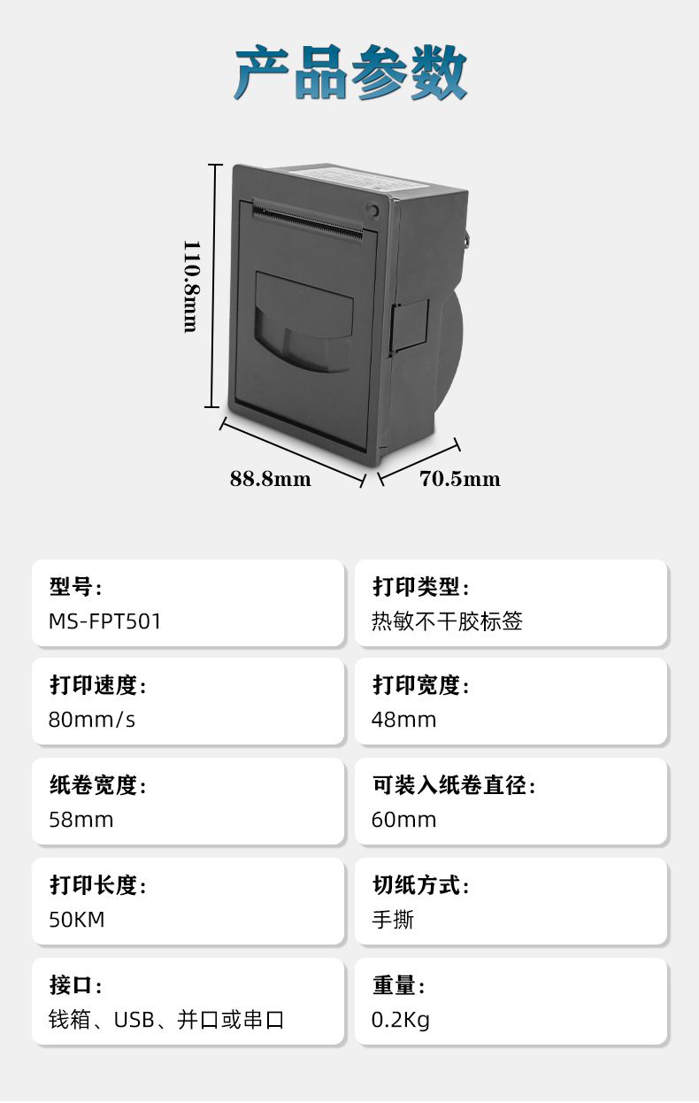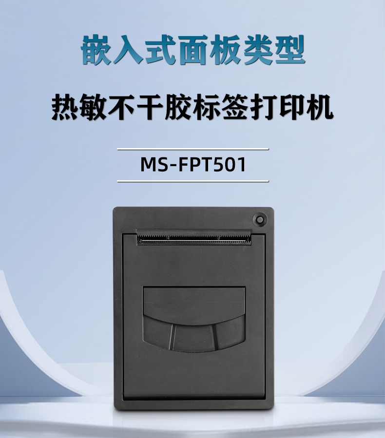 由美松研發(fā)的新型面板式熱敏不干膠標(biāo)簽打印機(jī),具有面板式打印機(jī)的易裝紙?zhí)攸c(diǎn),能輕松的嵌入到各種自助設(shè)備中,同時(shí)可快速的進(jìn)行維護(hù)換紙,MS-FPT501可打印的不干膠標(biāo)簽在58mm左右,同時(shí)可選擇多種接口,比如錢(qián)箱、USB、并口或串口(二選一),作為一款熱敏不干膠標(biāo)簽打印機(jī),MS-FPT501可廣泛應(yīng)用于商超零售標(biāo)簽,醫(yī)療標(biāo)簽,稱(chēng)重價(jià)格標(biāo)簽等多種行業(yè)標(biāo)簽。