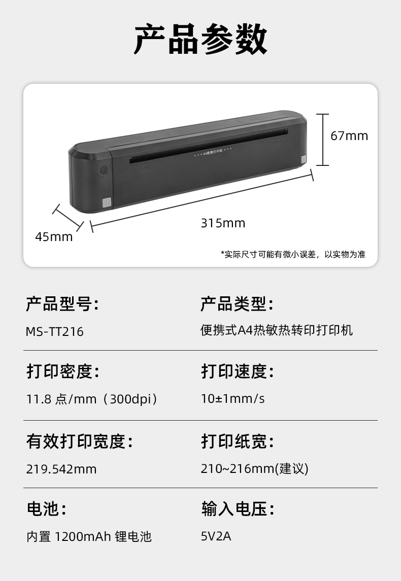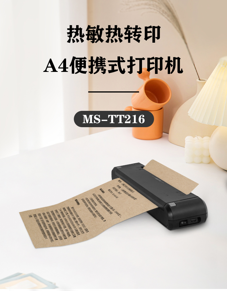 MS-TT216是美松的一款A4便攜式打印機,它的體積小巧打印的文字圖像清晰明亮, 同時具有熱敏打印模式和熱轉印打印模式, 在使用熱敏打印模式時,無需其他的耗材,只需要A4熱敏紙就可以進行打印,方便快捷 使用熱轉印模式進行打印,加入碳帶進行打印,打印的文字圖像更清晰明亮,保存時間更長 在使用的耗材紙張方面,可支持多種類型的介質打印 打印的介質厚度 0.07-0.12mm左右即可完美打印