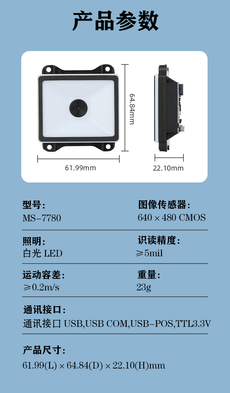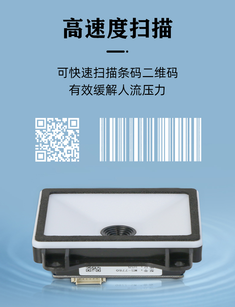 采用自主研發(fā)的核心技術(shù),極速響應(yīng),支持快速開發(fā)和定制需求手機(jī)可以貼的更近整機(jī)厚度僅 21MM,更方便集成超強(qiáng)電子屏碼解析對(duì)高密,低對(duì)比度,色彩條碼有較強(qiáng)的解析能力多種接口協(xié)議:USB、USB COM、TTL3.3V、等接口;物理接口形態(tài)有 12PIN 0.5mmFPC(選配)和6PIN MX1.25 間距端子座 集成蜂鳴器、補(bǔ)光燈、端子于一塊核心板 應(yīng)用場(chǎng)景: 車載 POS、閘機(jī)、門禁、電商自提柜、藥品售賣柜、自助查詢、排隊(duì)叫號(hào)、金融、醫(yī)療、快遞、收銀等自助設(shè)備等,對(duì)電子屏碼應(yīng)用場(chǎng)景尤為適合。