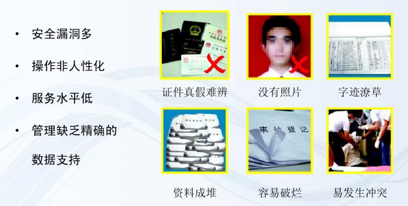 傳統(tǒng)人工手寫的來訪登記方式存在很多安全漏洞,如今假證橫行,辦理假證的犯罪手法也是日漸高明,直接導(dǎo)致門衛(wèi)無法用眼識別真假證件,并且人工登記復(fù)雜、繁瑣、紙質(zhì)登記不易保存查詢信息。網(wǎng)上經(jīng)常有報(bào)道訪客手工登記管理漏洞引發(fā)的安全事件接二連三,因?yàn)閭鹘y(tǒng)的訪客手工登記存在的問題太多。